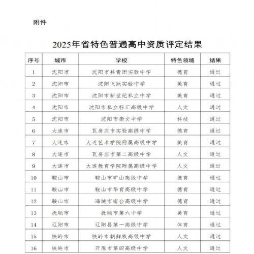 按照《关于开展2025年省特色普通高中资质评定工作的通知》(辽教通〔2025〕219号)要求,经自主申报、县级初选、市级推荐、材料审查、现场评定和专家评议,沈阳市共青团实验中学等21所学校达到省特色普通高中建设水平,其中锦州市第四高级中学等3所学校2026年需接受复审。另,2024年达标但需参加2025年复审的抚顺市第五中学等5所学校复审通过。现予以公示(见附件)。
