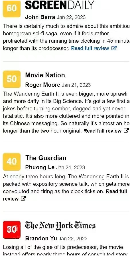 如果以两部好莱坞科幻大片作为参照,被封为科幻神作的《星际穿越》在烂番茄得分是72%和86%,经典灾难科幻片《后天》的烂番茄得分只有45%和50%,这样看来,《流浪地球2》目前在海外观众中的接受度与赞誉值还是相当不错的。也有不少海外观众给出了积极的评语。
