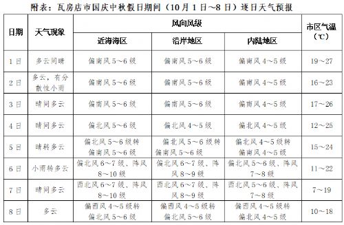 预计国庆中秋假日期间瓦房店市以晴间多云天气为主,9月30日、10月2日、10月6日有降雨天气(具体预报见附表)。