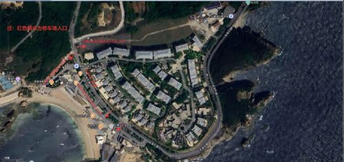 2.景区停车场饱和后,游客可沿红色箭头指示方向,由滨海东路前往虎滩小学东侧临时停车场停放车辆。