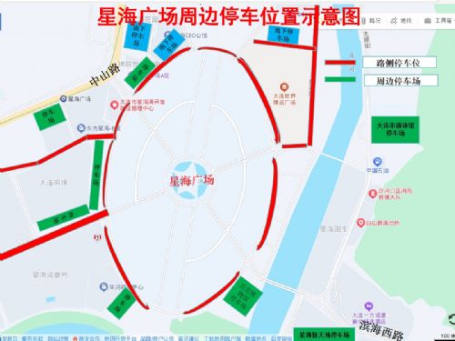 进入星海广场车辆可经中山路—会展路会展东路或会展西路及星河街进入星海广场外环路。