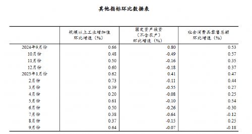 (2)根据季节调整模型自动修正结果,对近一年来各期国内生产总值、规模以上工业增加值、固定资产投资(不含农户)、社会消费品零售总额环比增速进行修订。修订结果及2025年三季度GDP环比数据、2025年9月份其他指标环比数据如下:2024年各季度及2025年一季度、二季度、三季度GDP环比增速分别为1.3%、1.0%、1.5%、1.5%、1.2%、1.0%和1.1%。