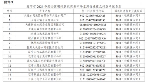 3. 辽宁省2026年度全国碳排放权交易市场水泥行业重点排放单位名录