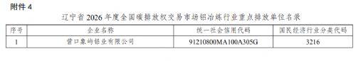 4. 辽宁省2026年度全国碳排放权交易市场铝冶炼行业重点排放单位名录