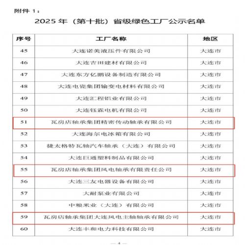 面向未来,瓦轴集团已立下新目标,计划用五年时间,实现集团下所有工厂的绿色化全覆盖,以蓬勃的“绿色新质生产力”,全面赋能传统轴承产业的转型升级,迈向高质量、可持续发展新阶段,为推动瓦房店轴承产业高质量发展贡献瓦轴力量。