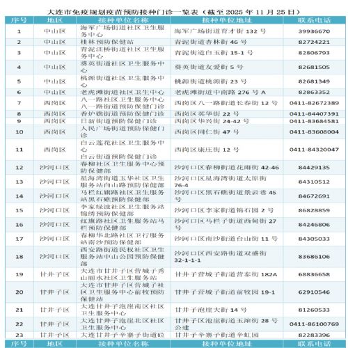 | 大连疫苗预防接种门诊更新了! | | 来源:新闻大连 微信公众号 点击数:764次 更新时间:2025/11/26 12:04:56 |