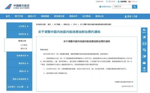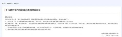 12月29日,机票销售平台飞常准App发布消息称,已接航司通知,自2026年1月5日0时起,国内航线旅客运输燃油附加费征收标准将进行下调。