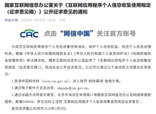 1月10日,据网信中国消息,为规范互联网应用程序个人信息收集使用活动,保护个人信息权益,促进个人信息合理利用,根据《中华人民共和国网络安全法》《中华人民共和国个人信息保护法》《网络数据安全管理条例》等法律法规,国家互联网信息办公室起草了《互联网应用程序个人信息收集使用规定(征求意见稿)》,现向社会公开征求意见。