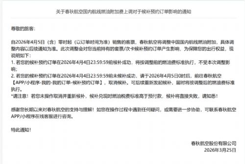 公告称,自2026年4月5日(含)零时起(以订单时间为准)销售的客票,春秋航空将调整中国国内航线燃油附加费,具体调整内容以后续通知为准。