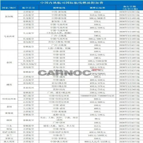 在国际航线方面,中国内地多家航空公司已经发布公告,调整国际航线的燃油附加费。