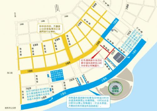 四、观众车辆在和丰路两侧、万鼎路的和丰路至共享街两侧和万鼎路以北的梭鱼湾地区道路停放。