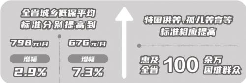 为进一步让困难群众共享改革发展成果,近日,我省各地普遍提高了低保等困难群众保障标准,全省城乡低保平均标准分别提高到798元/月、676元/月,增幅2.9%、7.3%,特困供养、孤儿养育等标准相应提高,惠及全省100余万困难群众。