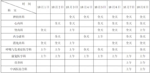肾内科10月7日、8日开诊;泌尿外科4日至8日上午开诊;胸外科7日上午、8日上午开诊。
