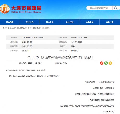 第三十条 本办法自2025年10月1日起施行,有效期五年。《关于印发<大连市高龄津贴发放管理办法(试行)>的通知》(大民发〔2022〕122号)《关于做好全市80周岁以上低保老年人和90周岁以上老年人高龄津贴发放工作的通知》(大民发〔2014〕56号)废止。各区市县可根据实际情况制定本地区实施细则。