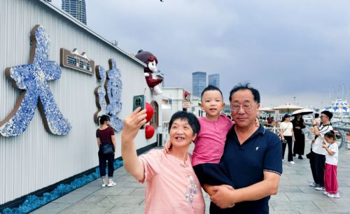国庆假期,大连的街头巷尾,随处可见举着相机或手机的市民游客。图为在大连东港旅游度假区,祖孙三人自拍记录游览的温馨时刻。大连新闻传媒集团记者张瑜 摄