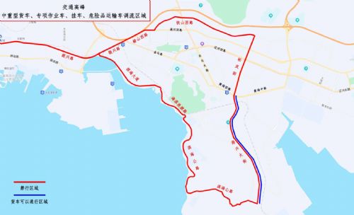 一、每日6时30分至8时30分、16时30分至18时30分,禁止中、重型载货汽车(不含中型厢式货车)、专项作业车以及危险品运输车在金普新区的振兴路、赫山西路、铁山西路、松岚街、港兴大街、滨海公路、海滨旅游路、滨海大道的围合区域及上述除港兴大街以外道路通行。