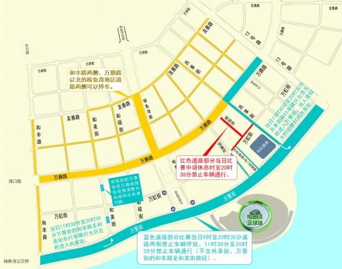四、观众车辆在和丰路两侧、万鼎路的和丰路至共享街两侧和万鼎路以北的梭鱼湾地区道路停放。