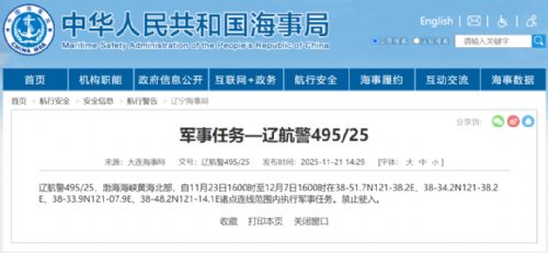 据中华人民共和国海事局网站消息,大连海事局发布航行警告,11月23日16时至12月7日16时,渤海海峡黄海北部部分水域范围内执行军事任务,禁止驶入。