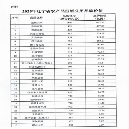 为贯彻落实质量强省品牌强省战略,打造辽宁优质特色农产品品牌,持续提升农产品区域公用品牌价值与影响力,助力乡村产业振兴,辽宁省农业农村厅、辽宁省市场监督管理局共同组织开展2025年农产品区域公用品牌价值测算。经评价,现将29个农产品区域公用品牌价值予以发布。