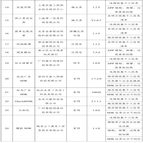 近期,经组织第三方检测机构进行抽查,共发现24款App及SDK存在侵害用户权益行为。