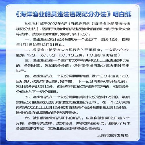 请瓦房店籍渔船船东和船员及时熟知相关记分规则,共同筑牢渔业生产安全防线。