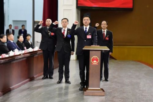 在热烈的掌声中,新当选的市监察委员会主任朱阿男、市人民法院院长杨鹏飞,与新当选的市人大两个专门委员会主任委员一同向宪法庄严宣誓。