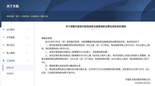12月29日,机票销售平台飞常准App发布消息称,已接航司通知,自2026年1月5日0时起,国内航线旅客运输燃油附加费征收标准将进行下调。
