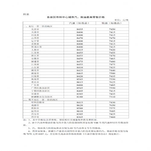 近期国际市场油价波动上升,根据1月20日的前10个工作日平均价格与上次调价前10个工作日平均价格对比情况,按照现行成品油价格机制,自1月20日24时起,国内汽、柴油价格(标准品,下同)每吨均上涨85元。调整后,各省(区、市)和中心城市汽、柴油最高零售价格见附表。