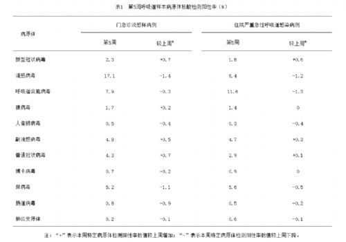 第5周,全国哨点医院报告的流感样病例数占门急诊就诊总数的比例(流感样病例百分比)为3.7%;哨点医院门急诊流感样病例呼吸道样本检测阳性率前三位病原体为流感病毒(17.1%)、呼吸道合胞病毒(7.9%)、鼻病毒(5.2%);住院严重急性呼吸道感染病例呼吸道样本检测阳性率前三位病原体为呼吸道合胞病毒(11.6%)、流感病毒(6.4%)、鼻病毒(5.6%)。