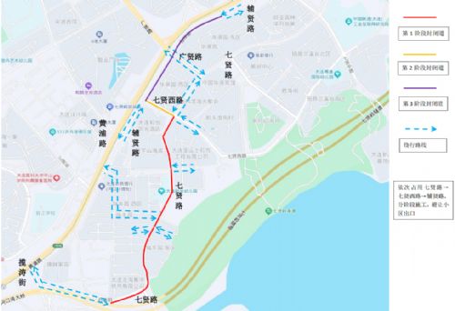 2.2026年5月1日9时0分至2026年5月3日5时0分,七贤西路(七贤路-辅贤路)逐段实施全幅封闭交通管理措施。施工期间,请提前选择七贤路—广贤路—黄浦路绕行;