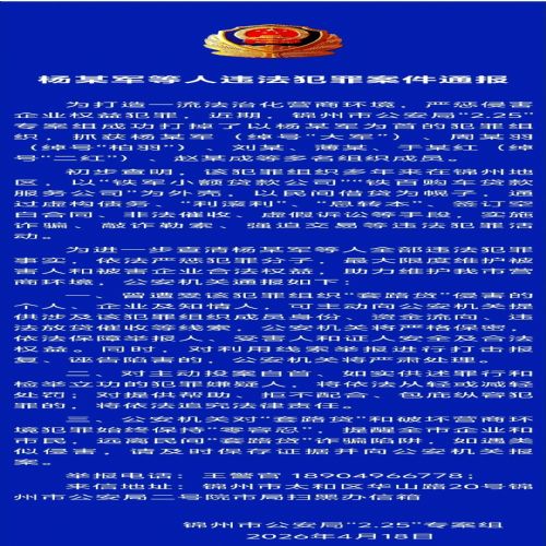 4月18日,辽宁省锦州市公安局“2.25”专案组通报杨某军等人违法犯罪案件。